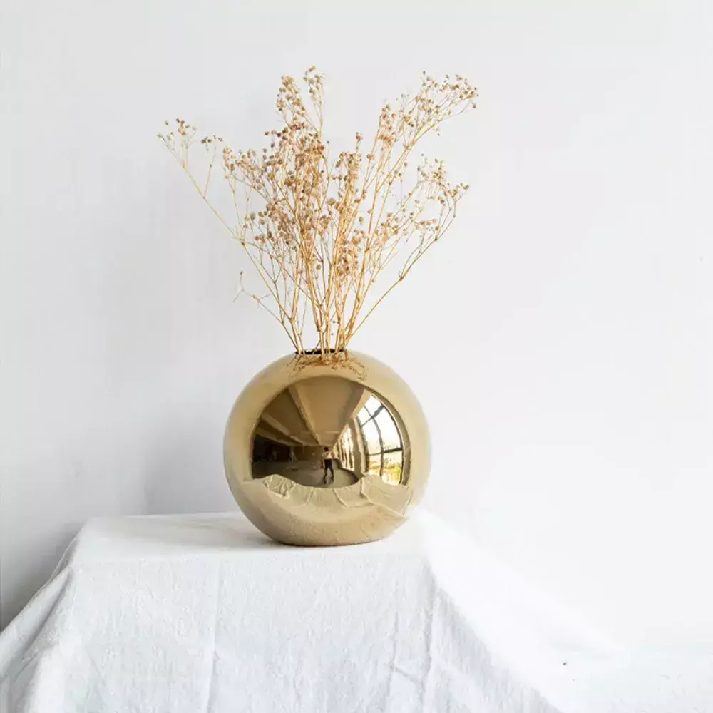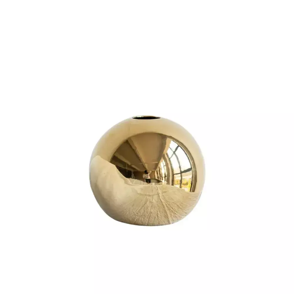 Vaso esférico dourado que se destaca sozinho ou combinado com arranjos sofisticados.